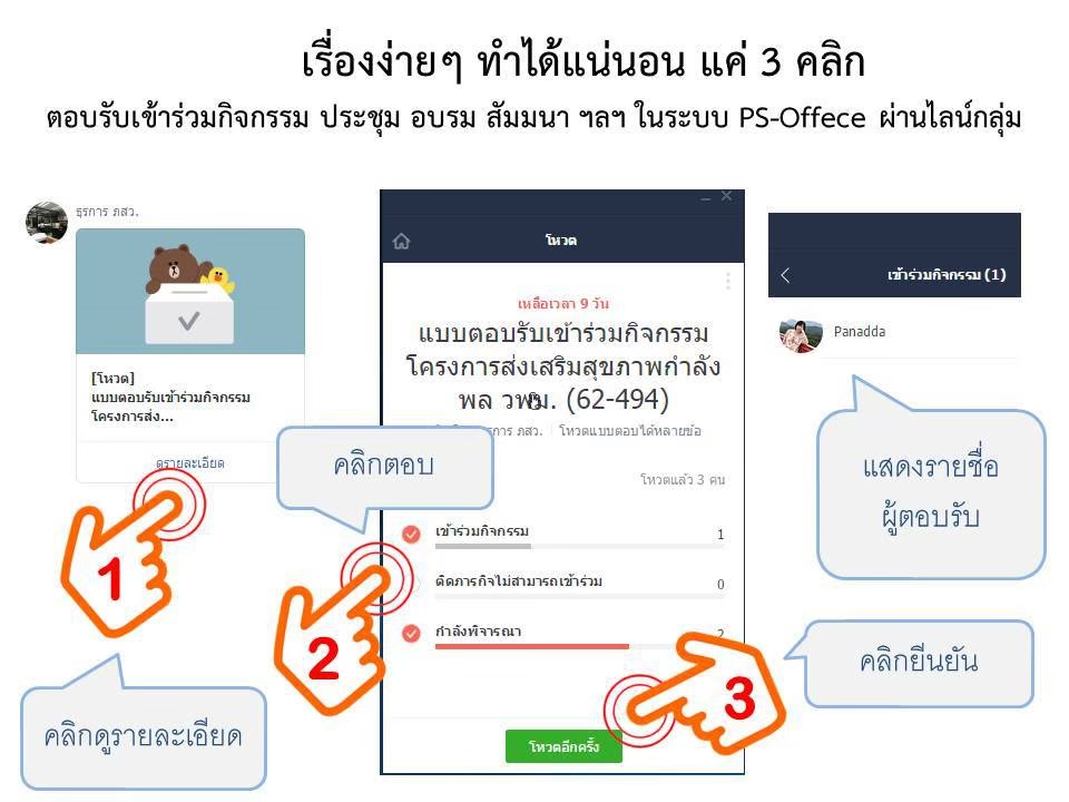 ตัวอย่างการปรับปรุงกระบวนการทำงานในด้านเอกสารทางธุรการ-หนังสือเข้าและการสือสารให้ทุกคนทราบ และการรวบรวมจำนวนคนที่ต้องการเข้าร่วมประชุมต่างๆ ผ่านทาง google form ที่ส่งผ่าน line กลุ่ม แสดงดังภาพด้านล่าง